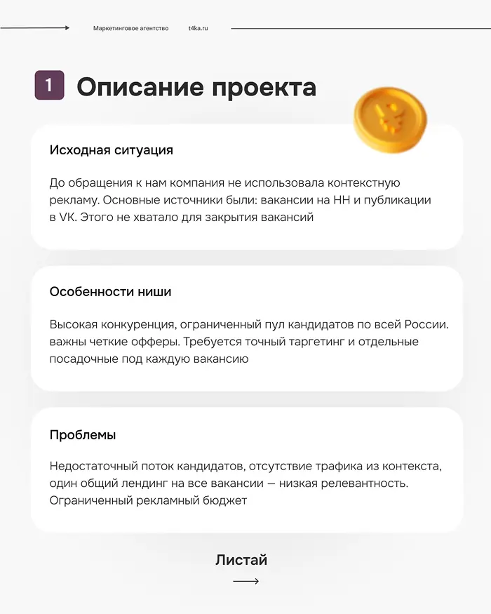 До обращения к нам компания не использовала контекстную рекламу. Основные источники были: вакансии на HH и публикации в VK. Этого не хватало для закрытия вакансий
