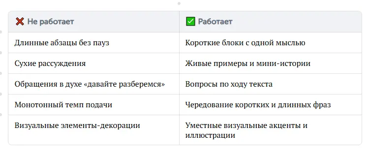 ✅ Хорошо: «Люди закрывают тексты, когда им скучно. Если говорить по делу — они остаются».