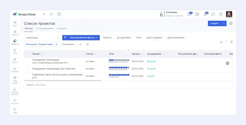 «Нам очень удобно работать с этим модулем. Еще мы создали список по всем нашим проектам. Не всем сотрудникам интересна финансовая часть, поэтому мы сделали статистику по направлениям и этапам работы, например, инженерному изысканию», — рассказывает Ксения Голубева.