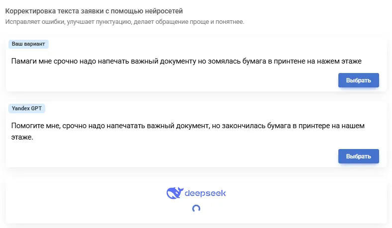 Теперь при создании новой заявки пользователь может выбрать опцию «Скорректировать обращение с помощью нейросети». После этого откроется окно, в котором будут представлены три варианта текста: оригинальный текст пользователя, вариант от YandexGPT и вариант от DeepSeek. Пользователю остаётся только выбрать наиболее подходящий вариант.