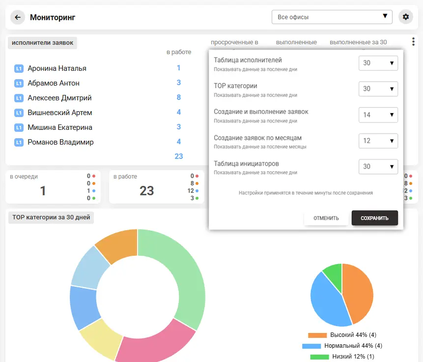Теперь в разделе «Мониторинг» администратор может задать период сбора данных для каждой диаграммы. Это позволяет анализировать статистику за любой интересующий промежуток времени.