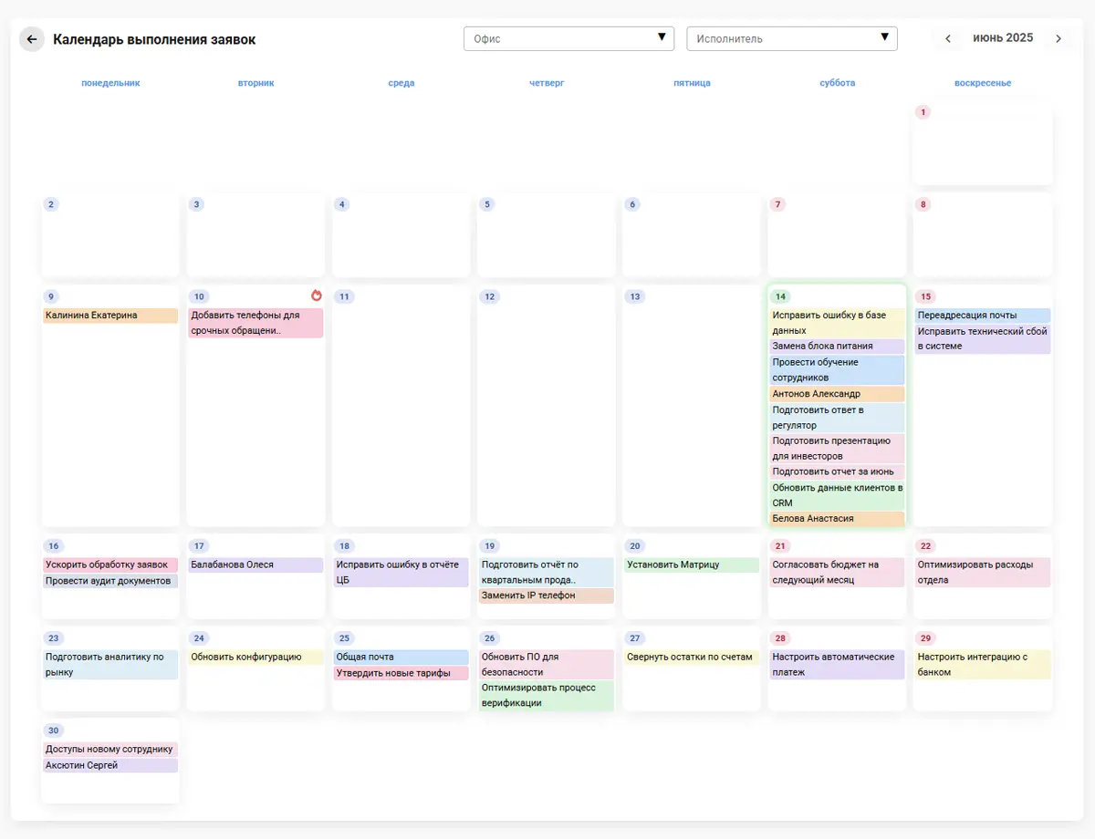 Календарь можно листать на любой месяц в прошлом или будущем, фильтровать заявки по исполнителям и офисам. Клик по любой заявке открывает её карточку. Это очень удобно!