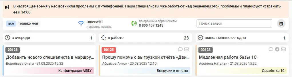 Администратор может создавать уведомления, которые отображаются пользователям в ленте заявок. Для каждого уведомления можно задать период показа, выбрать цвет, указать офисы, пользователям которых оно будет показано, а также сделать уведомление кликабельным — с переходом по заданной ссылке.