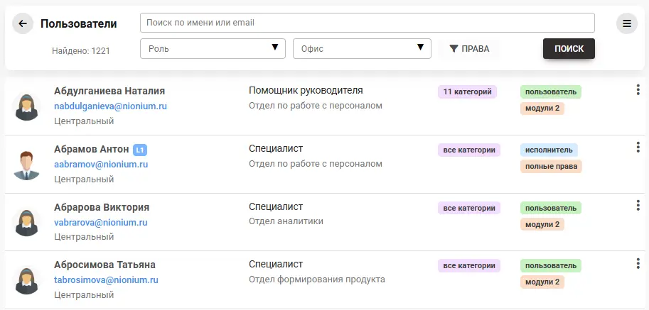 Во-вторых, мы реализовали расширенную фильтрацию: теперь пользователей можно искать по ролям, офисам и, что наиболее важно, по правам доступа.