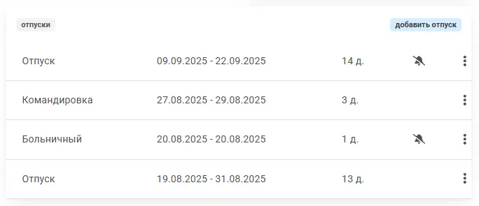 Кроме того, любой сотрудник может посмотреть историю отпусков другого сотрудника в его профиле.