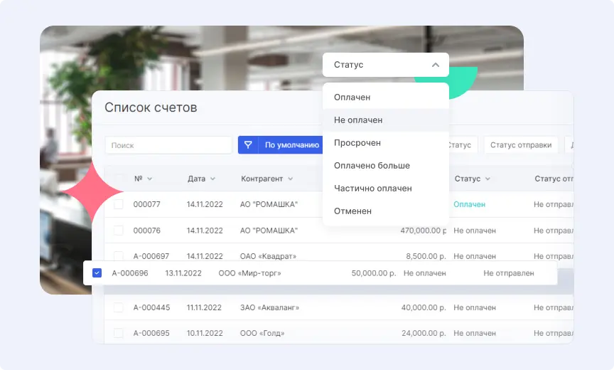 Система автоматизировала процесс отслеживания платежей. Руководитель видит статус каждого выставленного счета и может оперативно реагировать на просрочки.