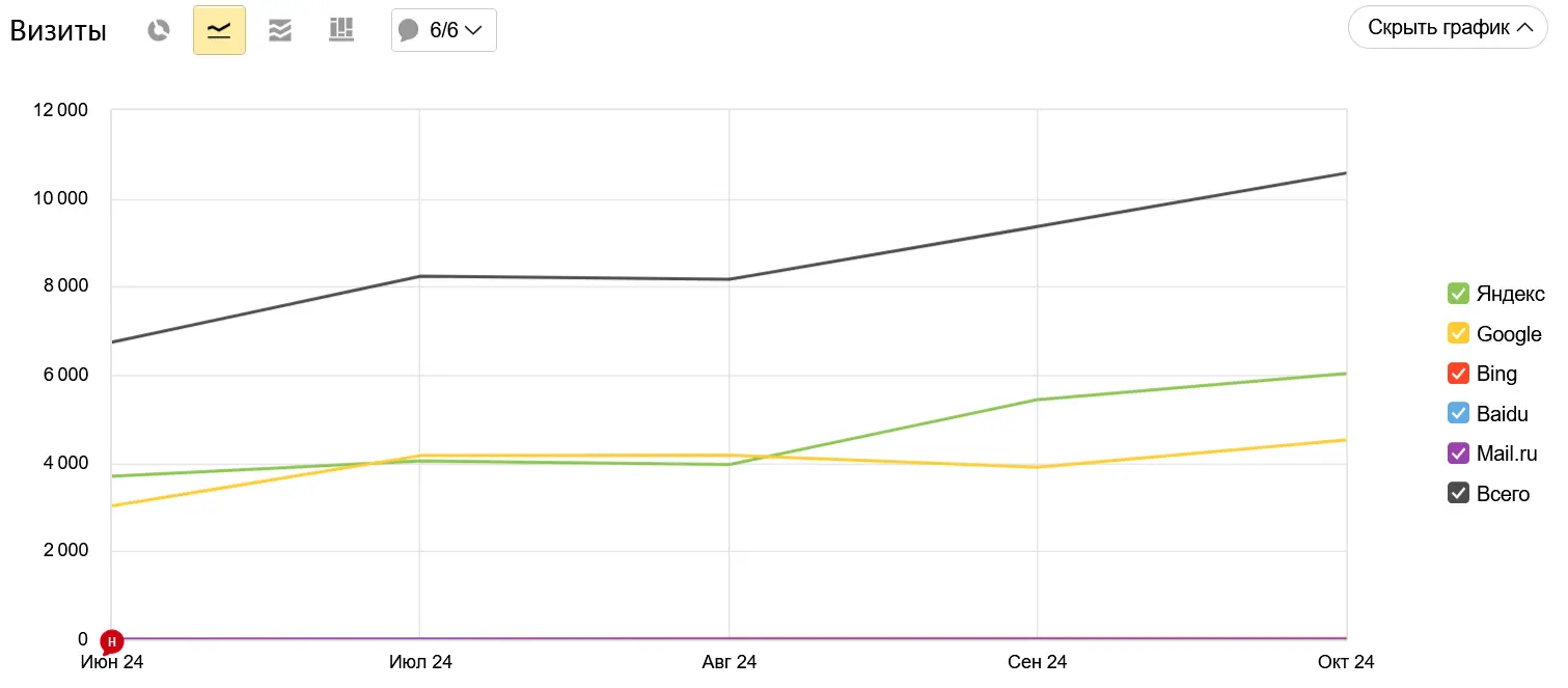 Колоссальный объем работы, проделанный за 5 месяцев интенсивной SEO-кампании, принес поистине впечатляющие результаты. По итогам сентября 2024 года органический трафик на сайт клиента вырос до 10500 переходов в месяц. Это означало увеличение на 57% по сравнению с исходным показателем в 6700 переходов до начала нашего сотрудничества.