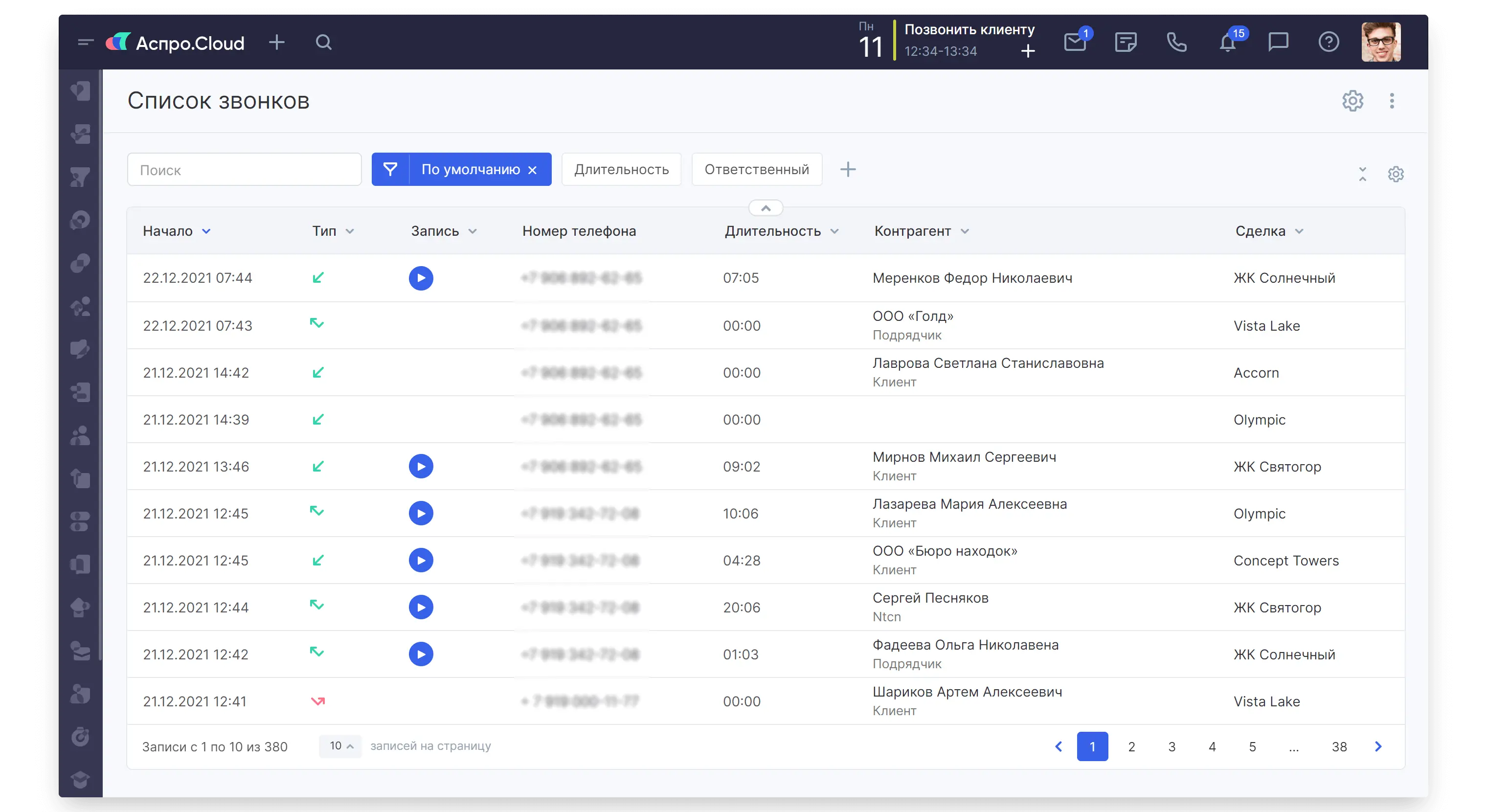 Встроенная телефония позволяет совершать звонки прямо из карточек контактов. Это исключает необходимость переключения между программами и автоматически фиксирует историе общения.