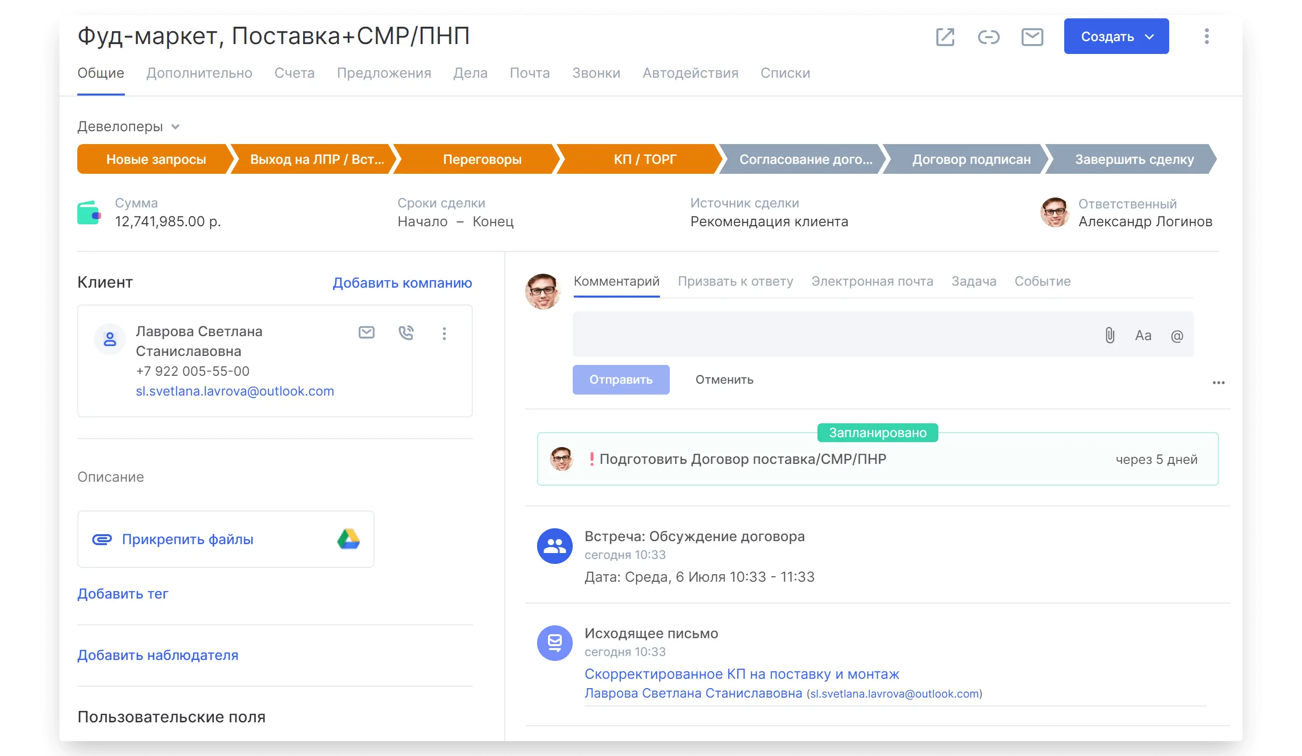 - Установление контакта — отправка презентации, планирование звонков и встреч