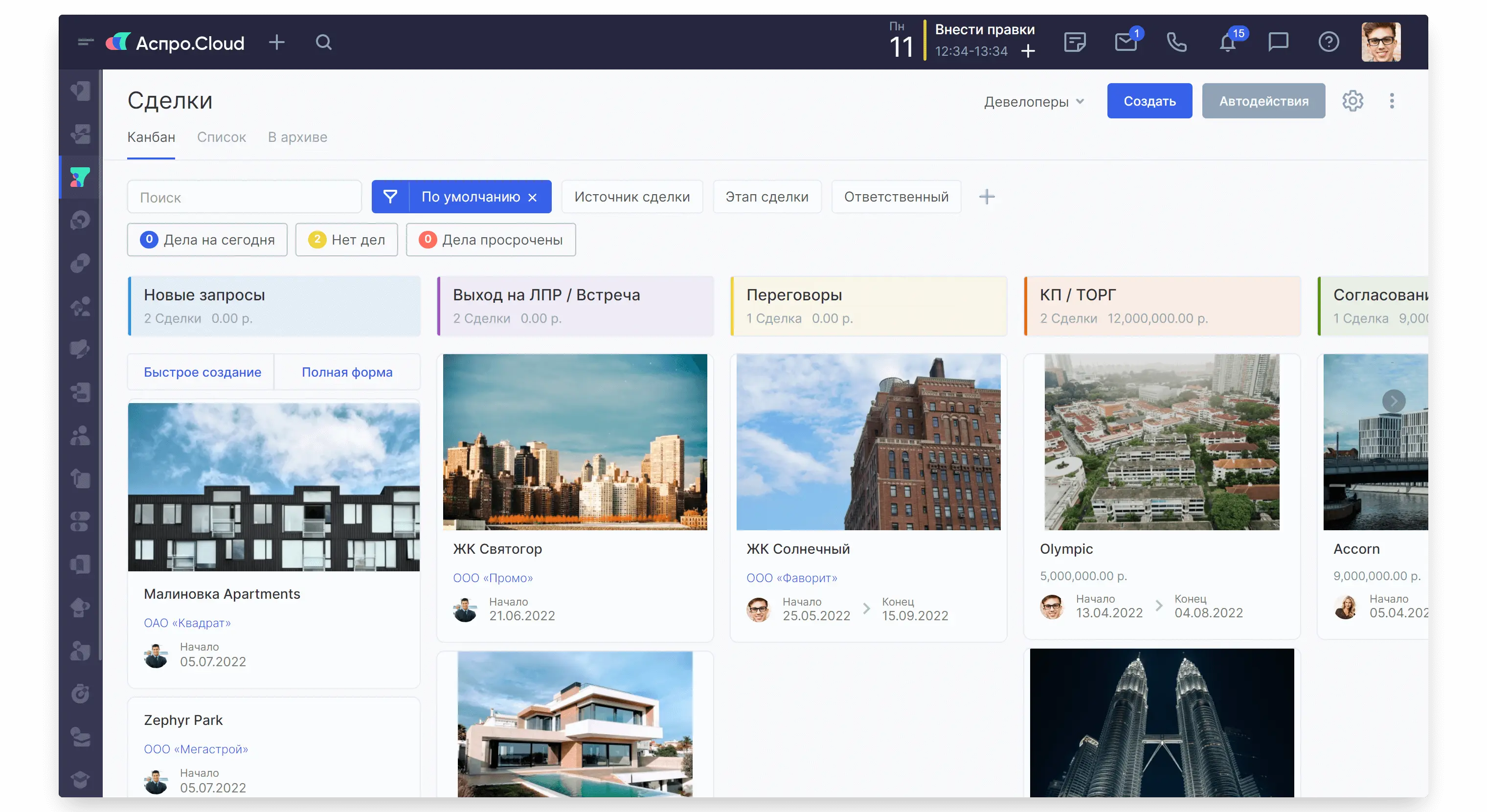 Архитектурное бюро XXIIIVEK выстроило полный цикл работы с клиентами в рамках единой платформы. Каждая входящая заявка автоматически создает детализированную карточку сделки.