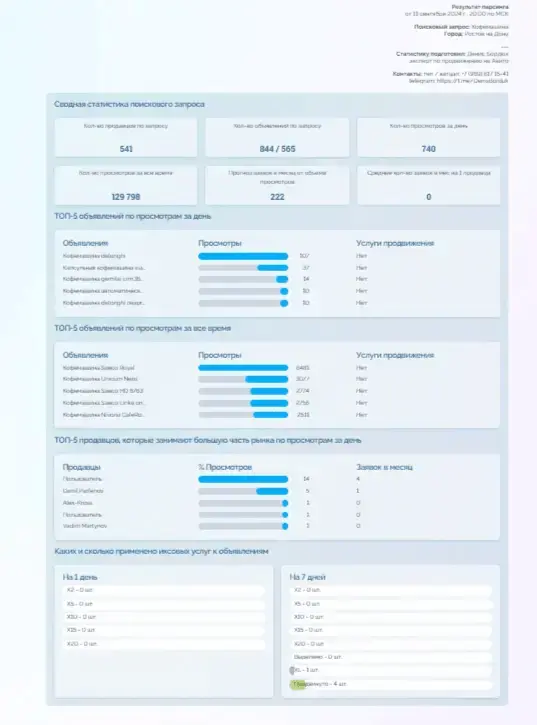 Формирую сводку по количеству публикаций и времени поднятия объявлений в ТОП выдачу. Т.е. можно посмотреть, когда лучше воспользоваться кнопкой "Продвигать" чтобы получить больше просмотров и количество заявок.