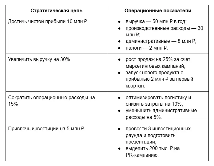Чтобы финансовый план был конкретным, стратегические цели нужно подкреплять цифрами и действиями. Вот как это может выглядеть: