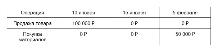 - Вы закупили материалы у поставщика на 50 000 ₽, и товар придет 5 февраля — расход появится именно в феврале, в момент получения.