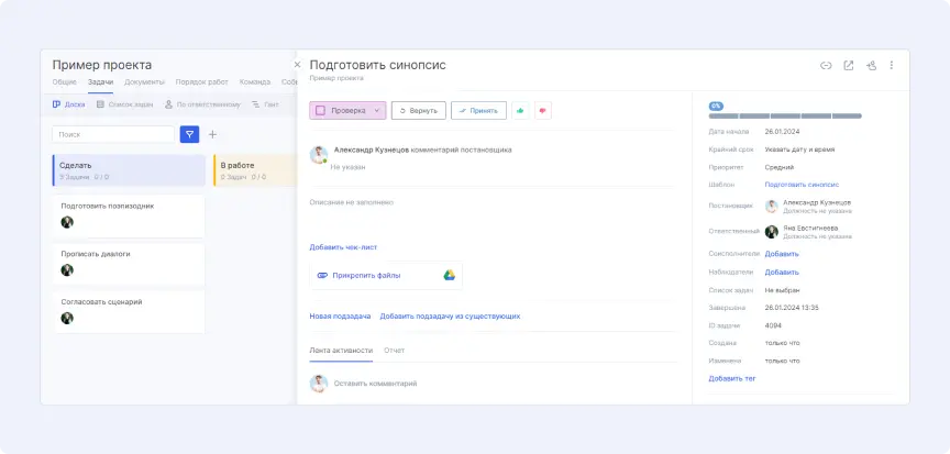 Важная особенность: сценарист не может самостоятельно закрыть задачу. Готовая работа обязательно проходит контроль качества.