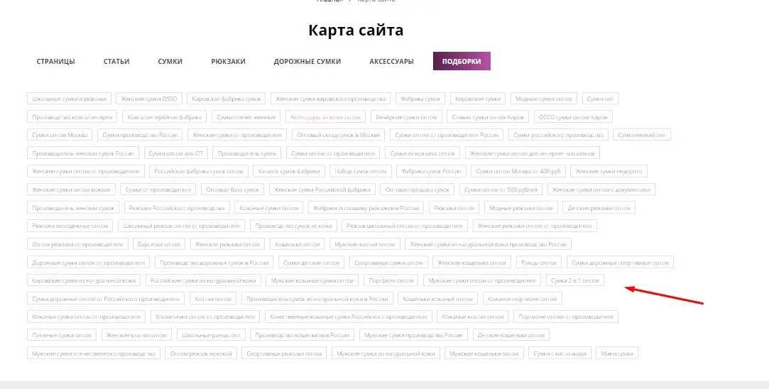 - Определение наиболее релевантных и ценных запросов: На основе анализа поисковых запросов и потребностей клиента мы выделили ключевые фразы, под которые необходимо было создать отдельные страницы. Среди них были такие, как "купить сумки из натуральной кожи оптом", "купить дорожные сумки оптом" и т.д.