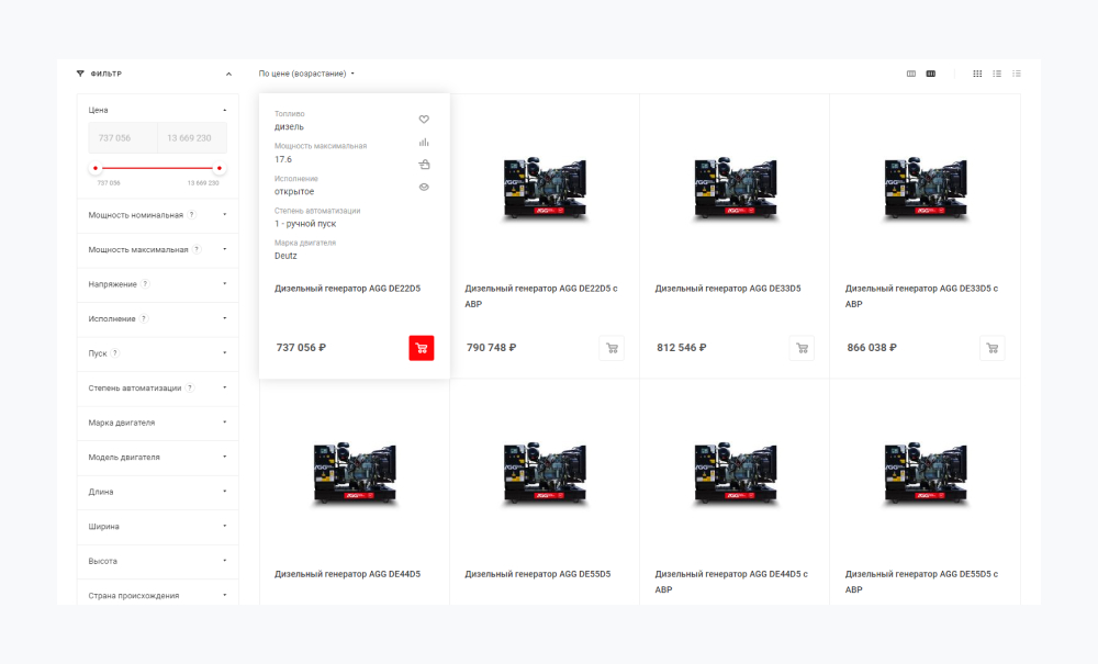 - При наведении курсора на товар показываются ключевые характеристики