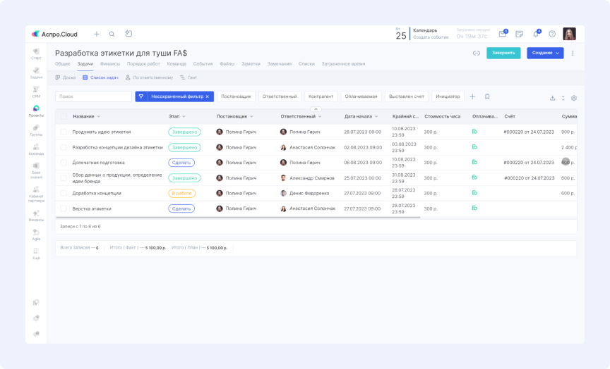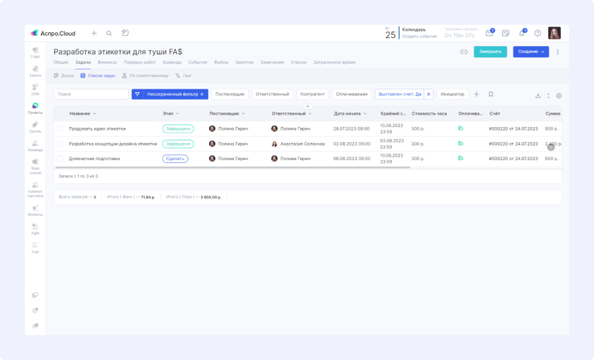 Поле «Сумма» в списке задач — позволяет видеть стоимость каждой задачи и проекта в целом, анализировать расхождения между планом и фактом.