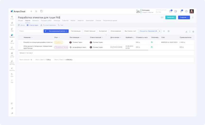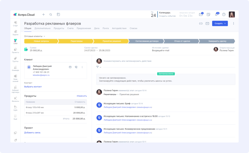 Опыт использования специализированных систем в производстве подсказал команде правильное решение. После анализа рынка CRM-систем выбор пал на Аспро.Cloud — платформу, которая могла быстро адаптироваться под специфику нового направления.
