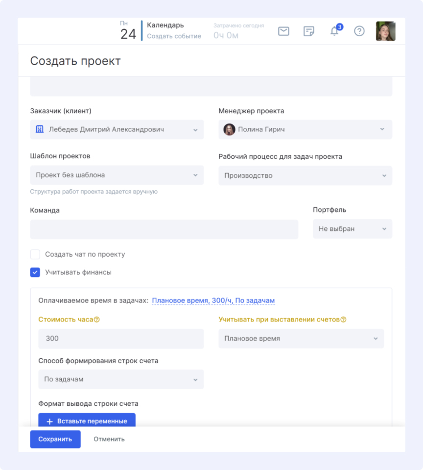 Менеджер создает проект и настраивает оплачиваемое время так, чтобы система считала сумму исходя из плана, а не факта. При выставлении счета система автоматически рассчитывает стоимость выполненных работ за период.