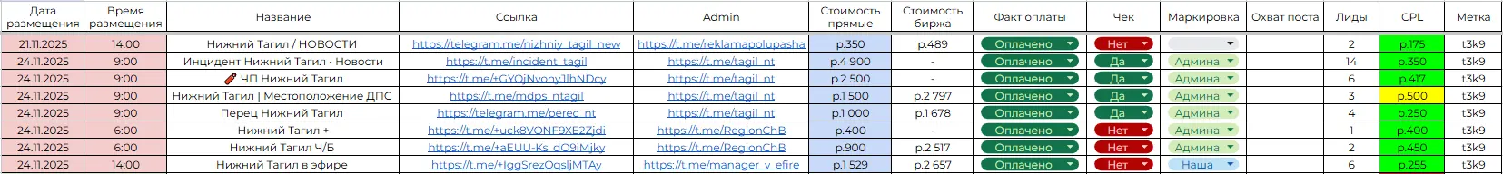 Я нашел все ключевые городские паблики через TGStat, связался с администраторами и начал договариваться. С админом одной из крупнейших сеток каналов ("Инцидент Нижний Тагил", "ЧП Нижний Тагил" и др.) мне удалось договориться о пакетном размещении "сеткой" в 5 каналах со скидкой, заплатив 6500р вместо рыночных ~9000р.