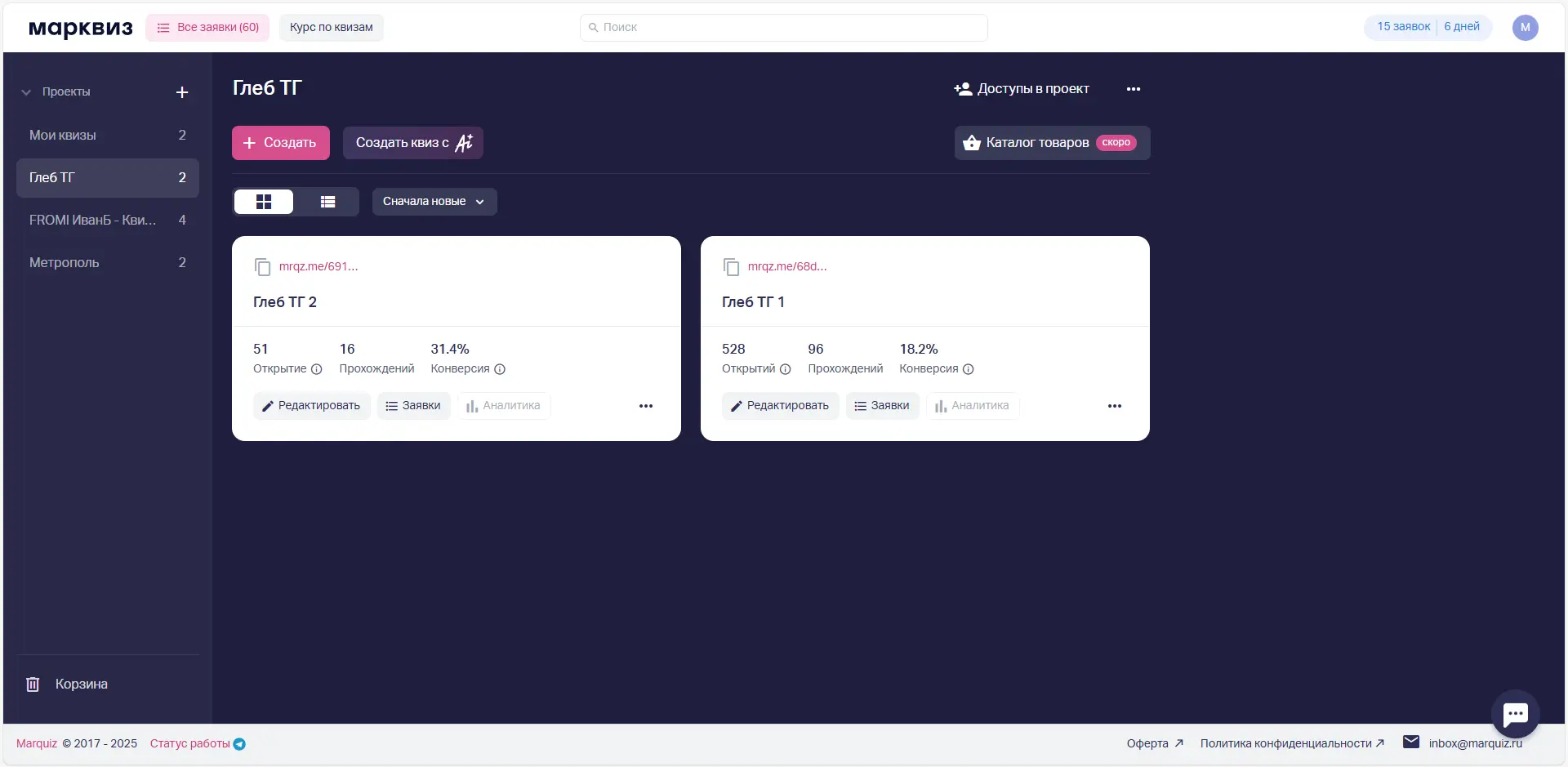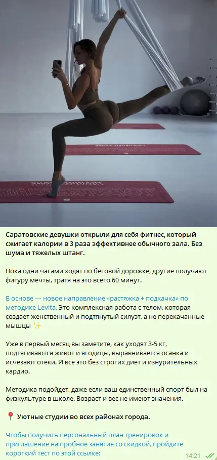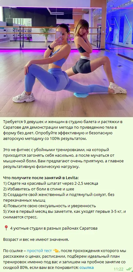 Я начал планомерно закупать рекламу в городских пабликах Саратова, новостных каналах и блогах. Весь трафик вел на квиз в Marquiz, где девушкам предлагалось пройти короткий тест и получить персональный план тренировок и скидку на пробное занятие.