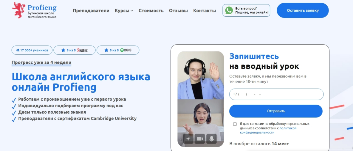 - Формат обучения: онлайн-занятия в реальном времени, вебинары, мини-группы, практика по коммуникативной методике