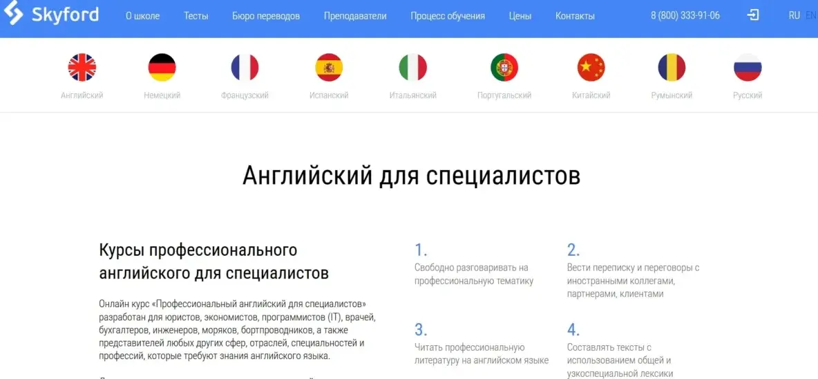 - Профессиональный английский для специалистов от Skyford — широкий охват профессий и обучение на материалах Oxford, Cambridge и Pearson с практикой деловой коммуникации.