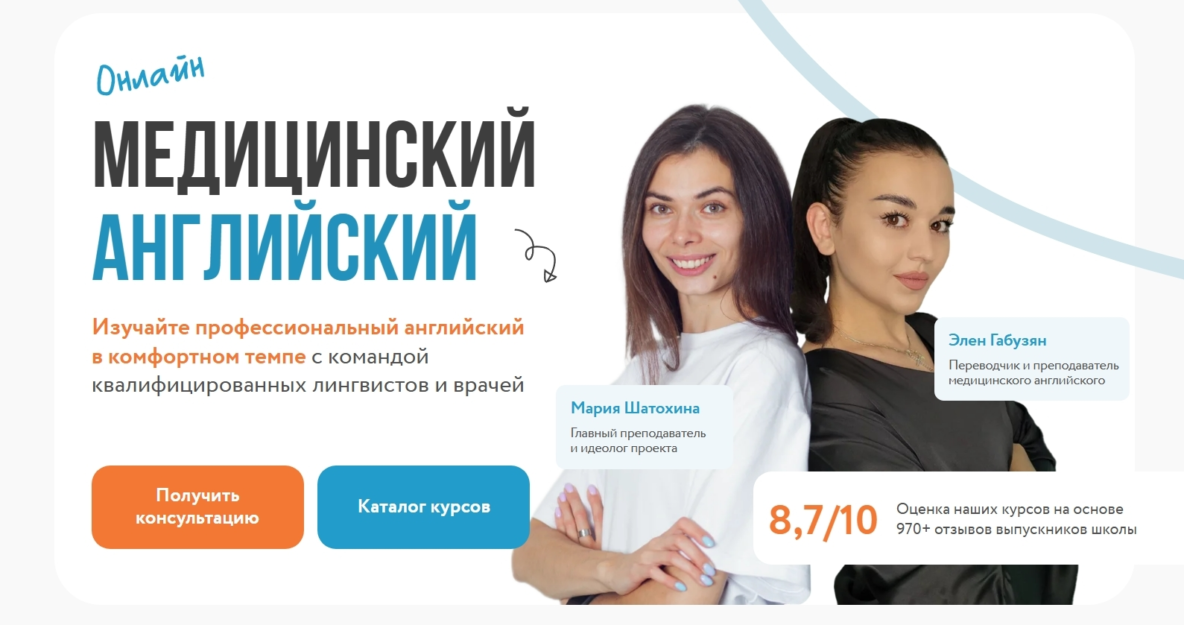 - Школа медицинского английского от Maxmed School — индивидуальные занятия с преподавателями-врачами и акцент на профессиональные диалоги и стажировочную лексику.