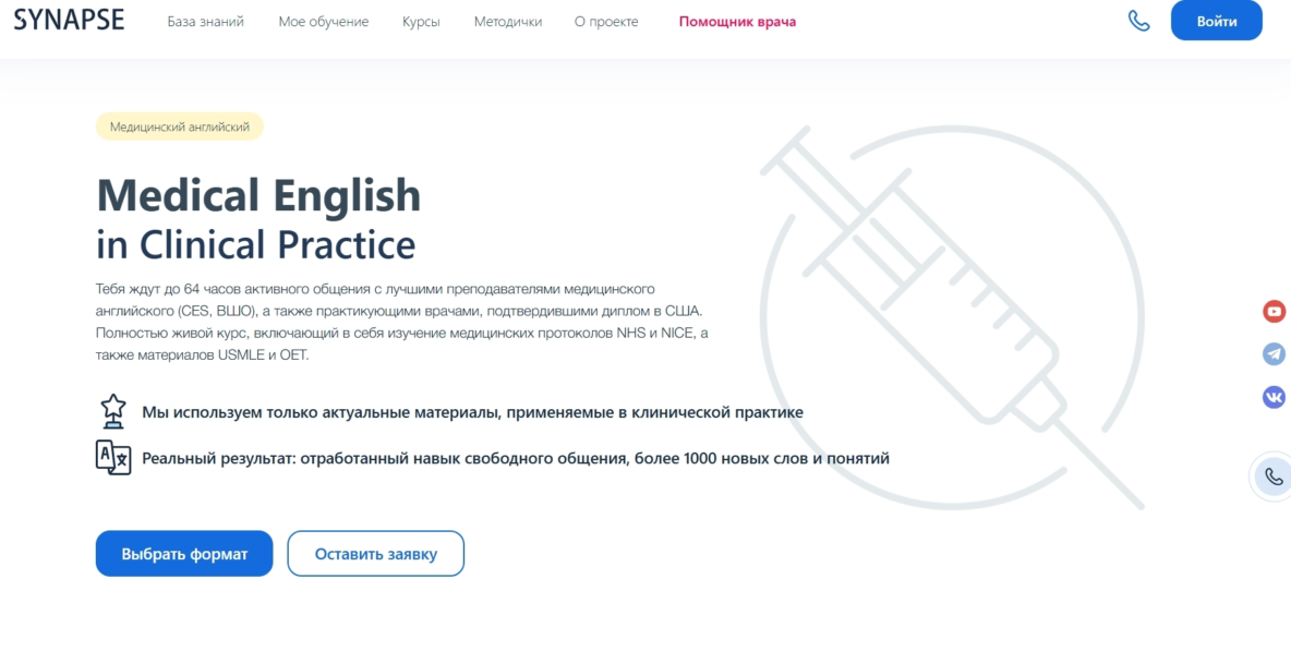 - Medical English in Clinical Practice от SYNAPSE — глубокая работа с клиническими кейсами и международными протоколами NHS, подготовка к экзаменам USMLE и OET.