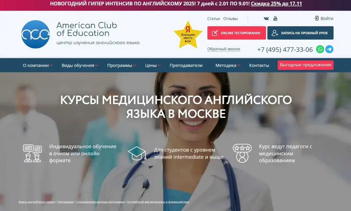 - Курсы медицинского английского языка от American Club of Education — гибкий формат обучения (онлайн, офлайн или комбинированно) и сертификат ACE, признанный в Европе и США.
