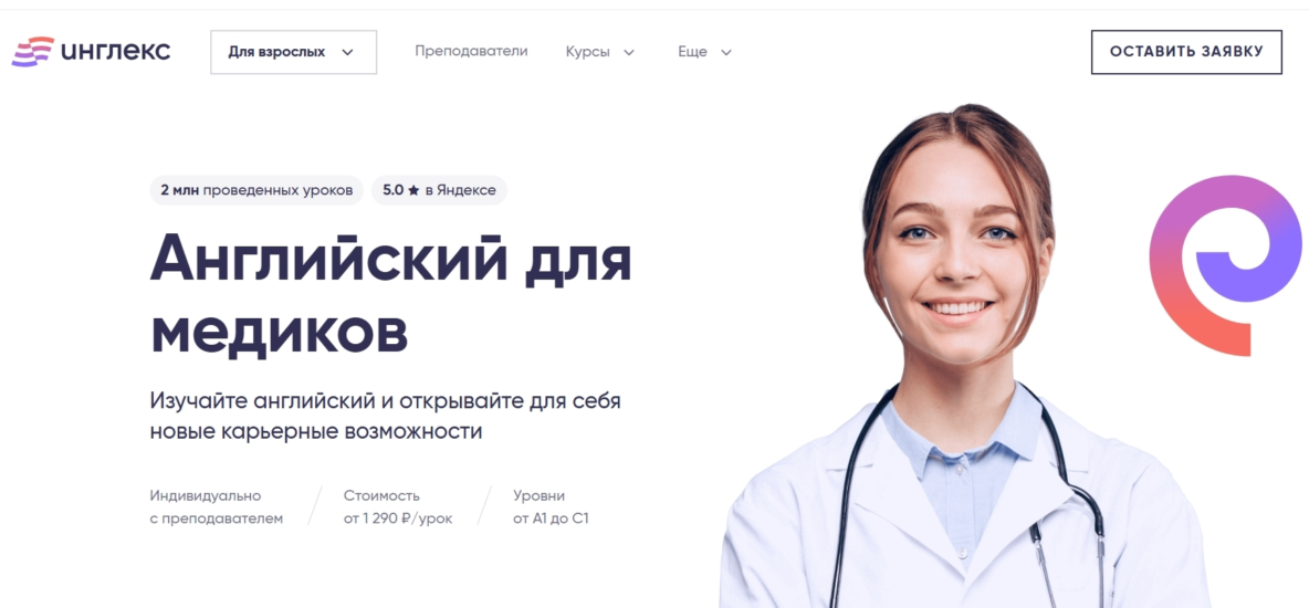 - Английский для медиков от Инглекс — персональный подход и постоянная обратная связь от преподавателя, что помогает быстро достигать профессиональных целей.