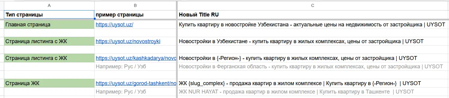 Заголовки страниц (теги <h1>) были сформированы таким образом, чтобы максимально точно отражать содержание и релевантность по целевым запросам. Например, для страницы https://uysot.uz/andijan/kvartiri заголовок выглядел следующим образом: "Новые квартиры из Андижанской области".
