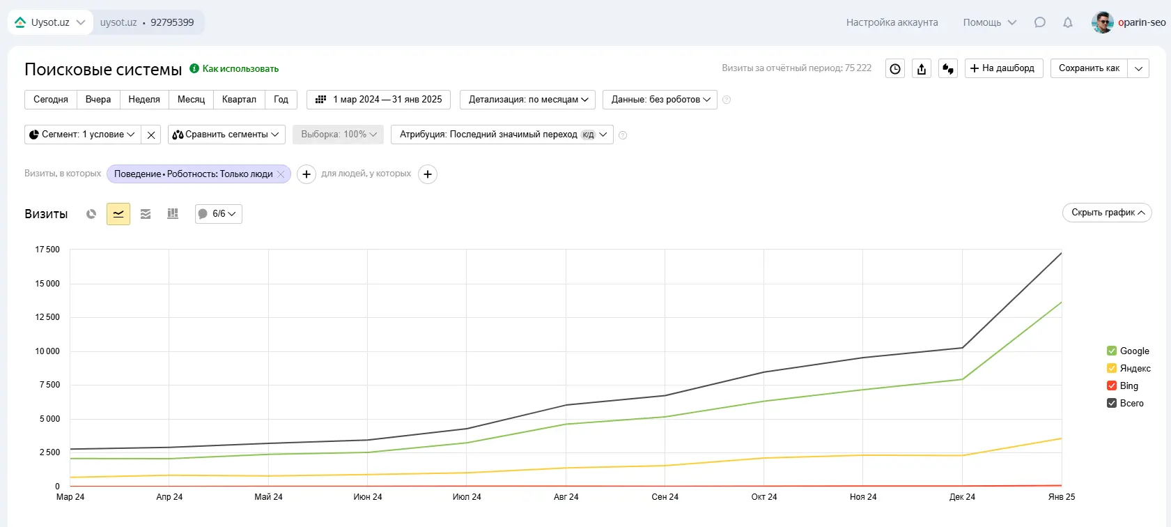 Результаты нашей работы по SEO-оптимизации и продвижению сайта https://uysot.uz/ оказались поистине впечатляющими. За 5 месяцев, с сентября 2024 года по январь 2025 года, органический трафик на сайт вырос с 6735 до 17282 переходов, что составляет рост на 257%.