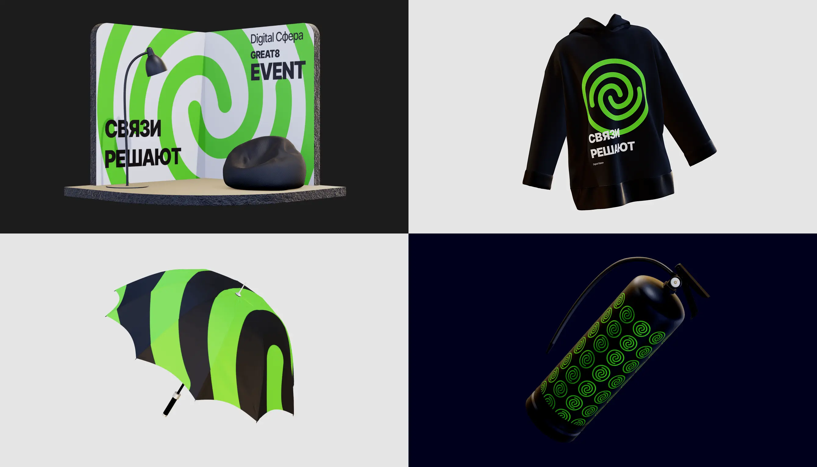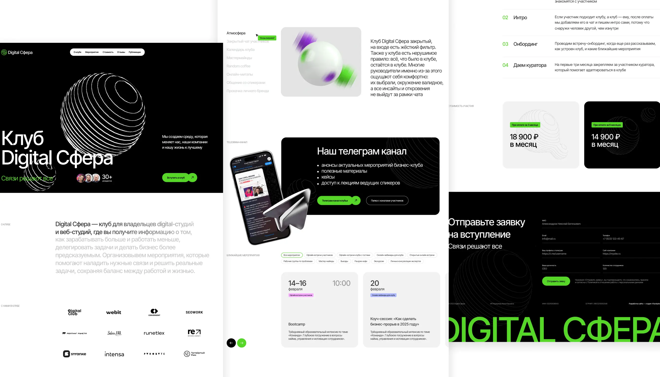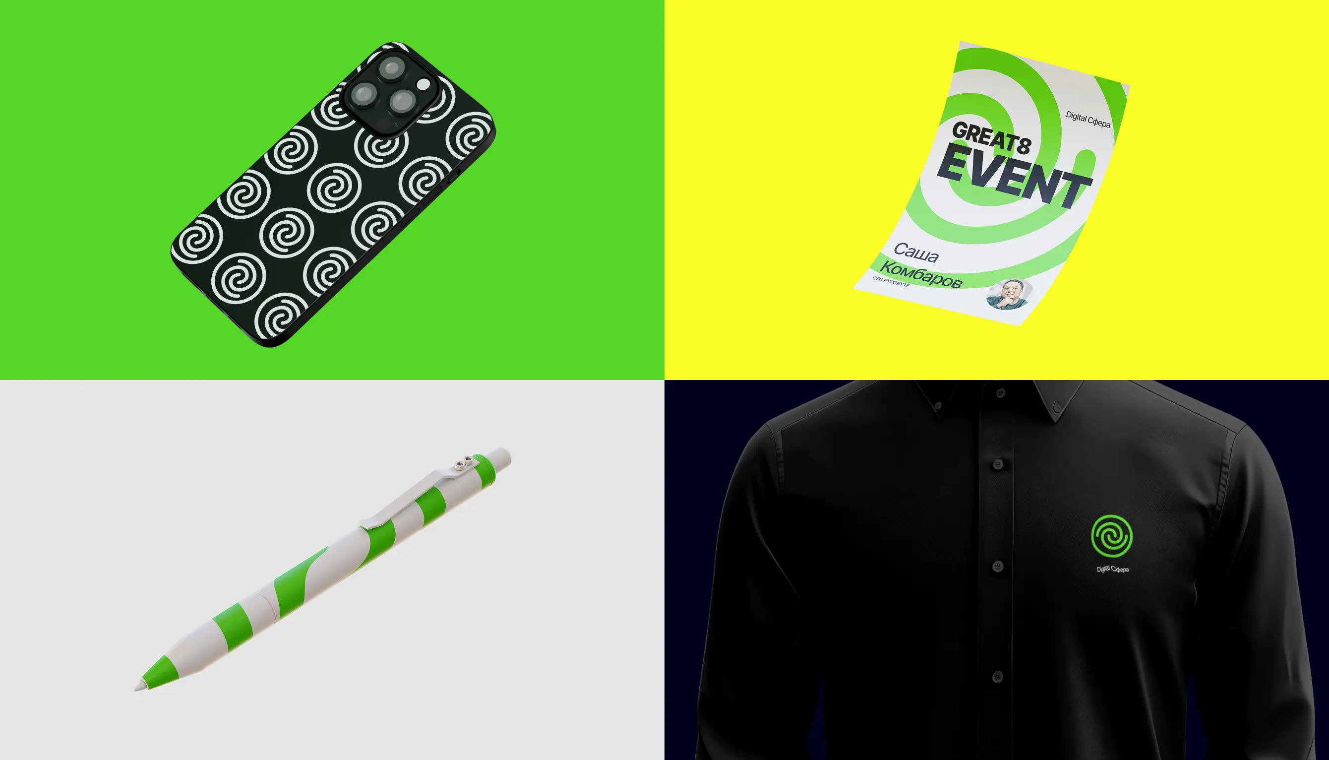 Черный базовый цвет, зеленые акценты и схематичные линии создают узнаваемый образ, отражая дух и ценности Digital Сферы.