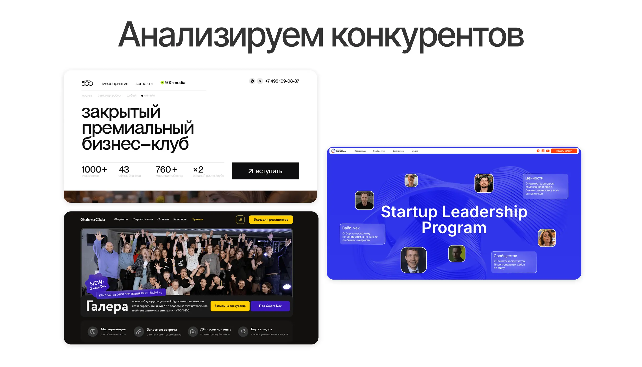 Работу мы начали с того, что изучили клубы, которые ориентируются на руководителей диджитальной тусовки. Сайты Galera Club и CLUB 500 стали для нас отправной точкой. Мы выделили ключевые элементы, которые должны быть на сайте: от структуры до функционала. Но наша цель была не просто соответствовать, а выделяться.