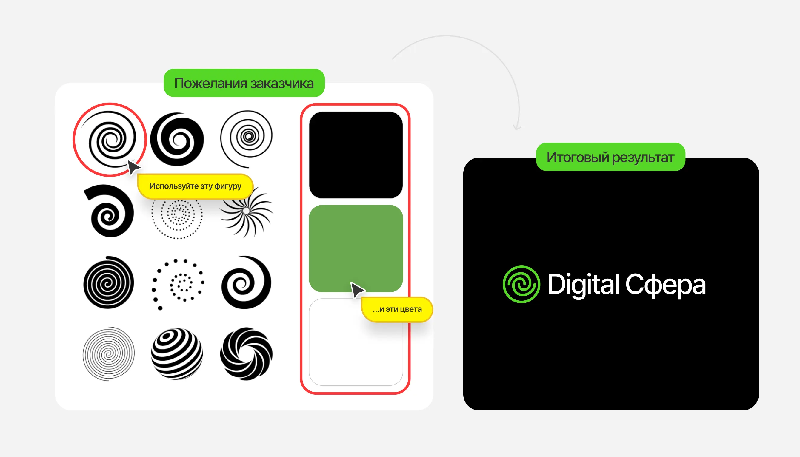 К разработке логотипа клиент подошел с большой вовлеченностью — Анна заранее сгенерировала несколько вариантов логотипов с помощью нейросети, чтобы визуализировать свою идею, витающую с прошлого года — спираль.