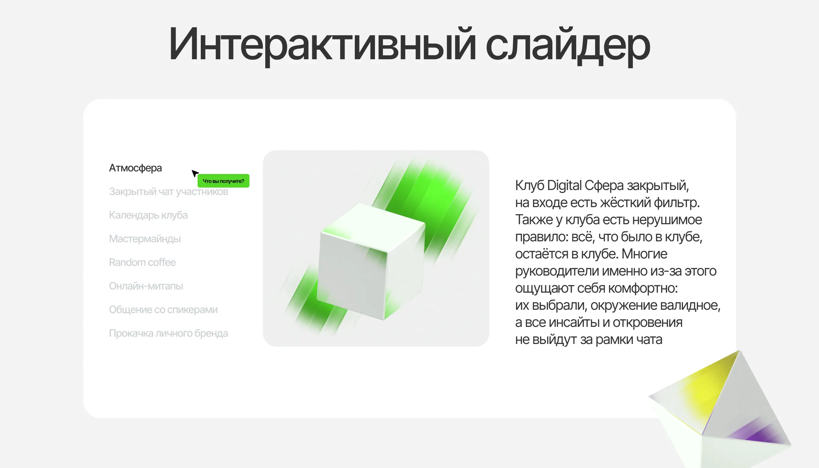 На главной странице сайта мы решили сделать анимацию сферы. Эта геометрическая фигура символизирует сам клуб, а маленькие сферы, разбегающиеся при наведении курсора — мини-сообщества, которые зарождаются внутри него.