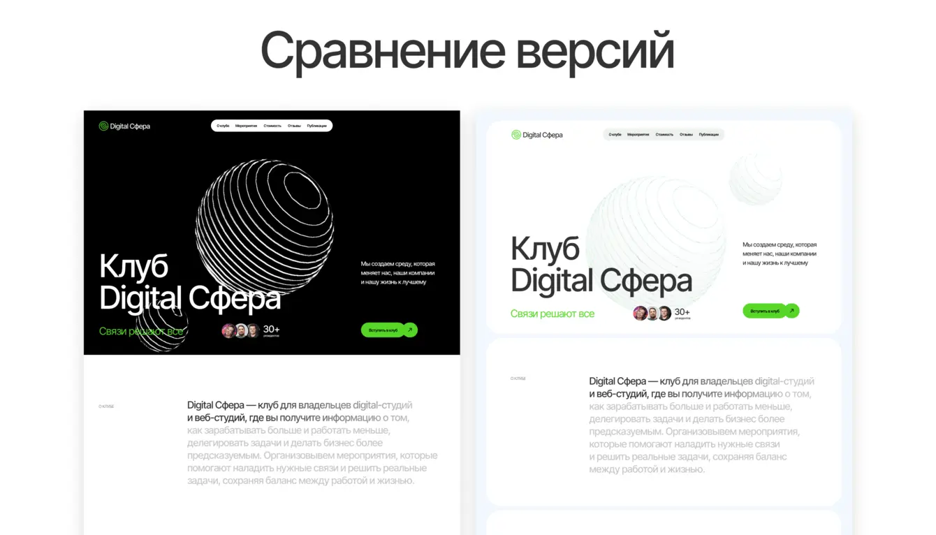 Одна из главных ценностей клуба — люди. Сайт должен передавать атмосферу сообщества без кричащих заголовков, потому что Digital Сфера не про достигаторство, а про рост компаний через развитие их руководителей.