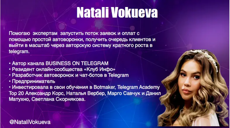 Меня зовут Натали Вокуева. Я — эксперт по системному росту в Telegram и создатель авторской методики «Telegram-автопилот».