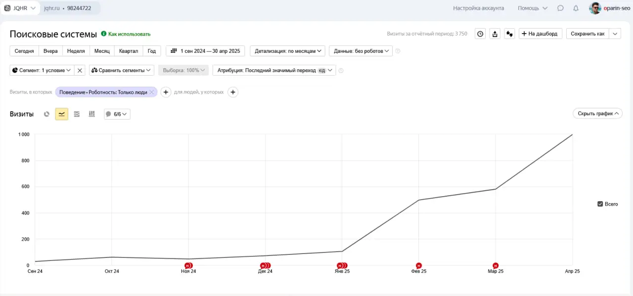 - Рост органического трафика: Количество переходов с Яндекса увеличилось с менее чем 100 уникальных пользователей в месяц до более 1200. Это свидетельствует о значительном улучшении видимости сайта в поисковой выдаче.