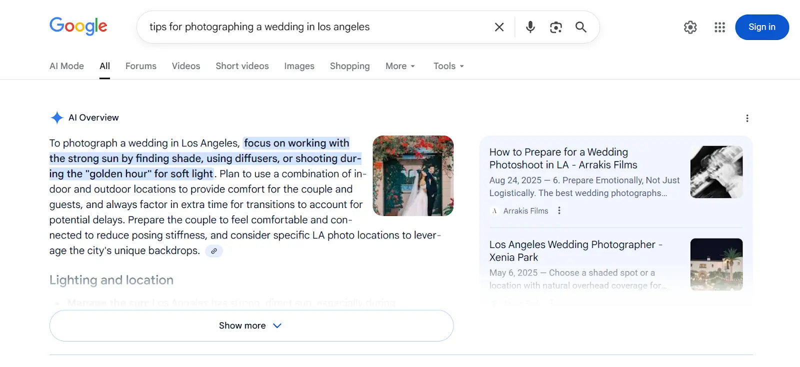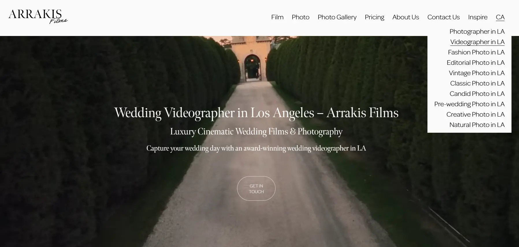 Мы создали и опубликовали страницы под фото- и видеосъемку в Лос-Анджелесе по тому же принципу, что и для Нью-Йорка: с четкой структурой, галереями и оптимизацией под локальные запросы. К моменту, когда команда Arrakis Films Wedding приступит к съемкам в новом городе, сайт уже будет занимать хорошие позиции в выдаче и сможет привлекать локальные заявки. Кроме того, мы сделали и блоговые статьи про свадебную фотосъемку в Лос-Анджелесе.