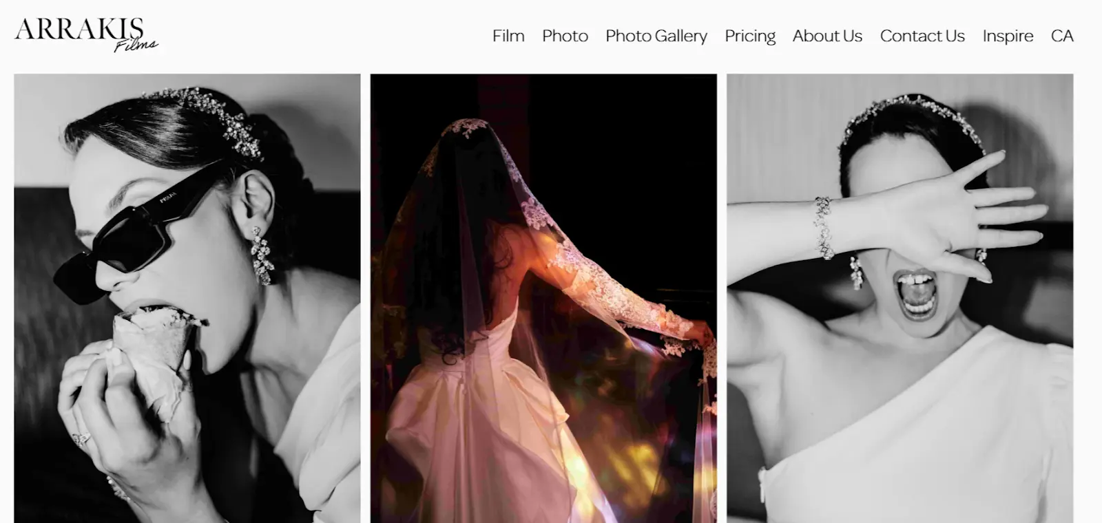 При подготовке контента мы учитывали визуальные особенности отрасли. Дело в том, что большинство американских сайтов свадебных фотографов и видеографов из поисковой выдачи имеют спокойные тона и черно-белые фото. Мы старались от конкурентов не отставать, но при этом стремились выделить Arrakis Films Wedding в общем потоке. Поэтому добавили живые кадры и легкие сюжетные акценты. Например, на одной из страниц героиня ест шаурму в свадебном образе: мелкая деталь, но она сразу задает настроение и отличает бренд.