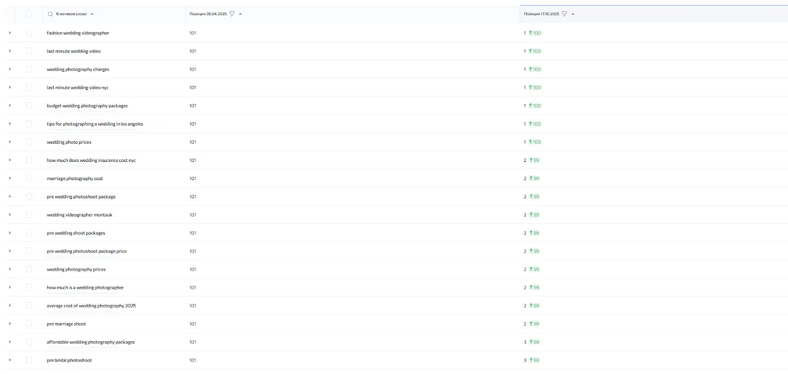 Далее перешли к расширению структуры сайта. Мы предположили, что отдельные страницы под конкретные типы съемок смогут дать быстрый результат. Такие запросы менее конкурентны, но при этом часто совпадают с реальными поисковыми фразами: пользователи ищут не просто «wedding videographer», а, например, «cinematic wedding video» или «pre-wedding photo».