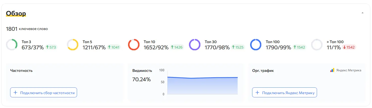 Отдельно необходимо указать, что вследствие внедрения новых страниц и проработки имеющихся получилось добиться очень качественного результата по росту позиций - более 90% ключей в отслеживаемой семантике находится в ТОП10