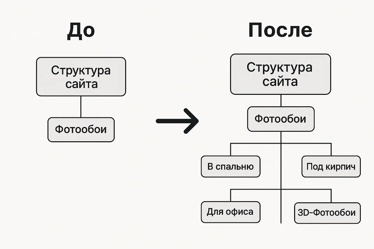 - Привели адреса страниц к единообразному и логичному виду: site.ru/fotooboi-v-spalnyu, site.ru/fotooboi-dlya-kuhni