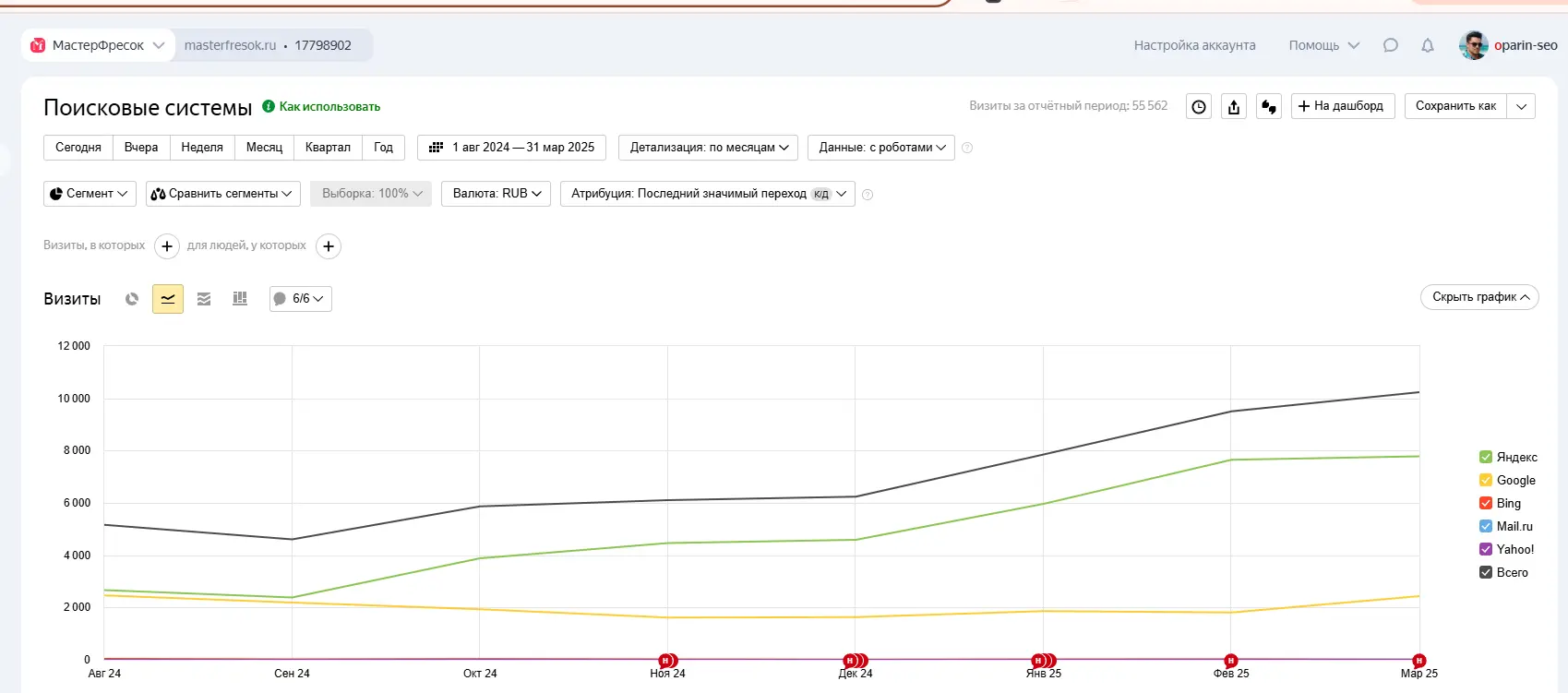Проект стартовал в октябре 2024 года с уровня 5 866 визитов в месяц из органического поиска. Уже в течение первого месяца — после технического аудита и устранения ошибок — начался положительный рост.