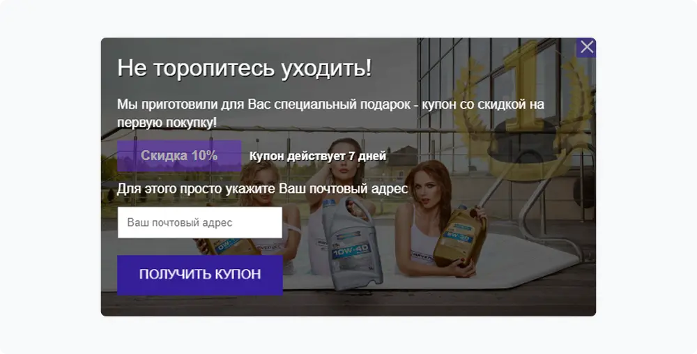 Команда Oil-Centr добавила кастомное маркетинговое окно с предложением скидки за подписку для сбора контактов и повышения конверсии.