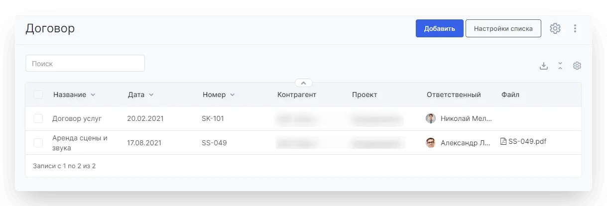 - Быстро находить нужный договор через карточку проекта.