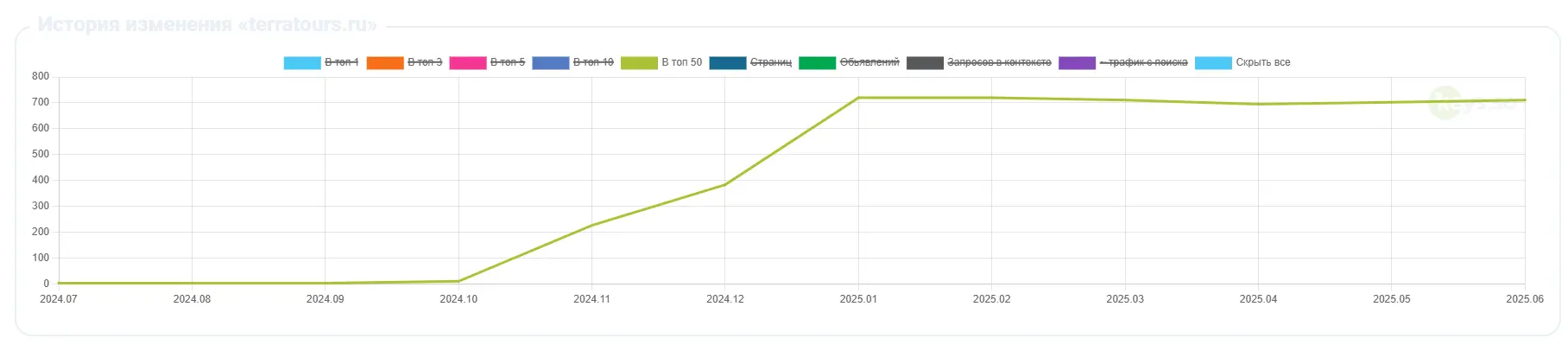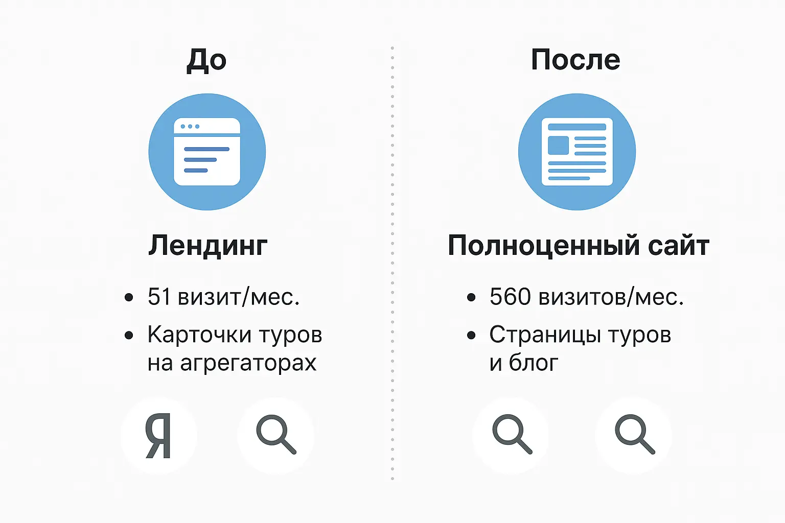 Поскольку сайт представлял собой лендинг, он не индексировался как полноценный сайт с категорией туров, блогом или фильтрами. Мы зафиксировали: