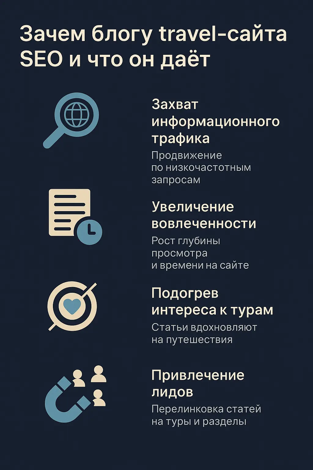 - Подогревать интерес к турам через статьи — и переводить в лиды.
